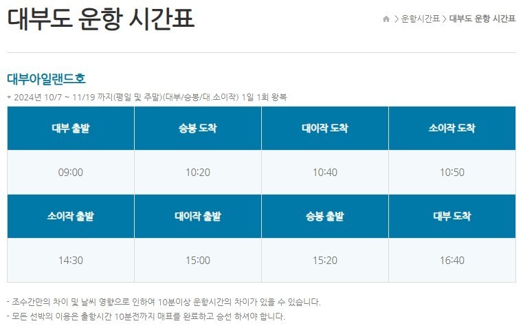 대부도 방아머리선착장에서의 배시간표 (2024년 11월)